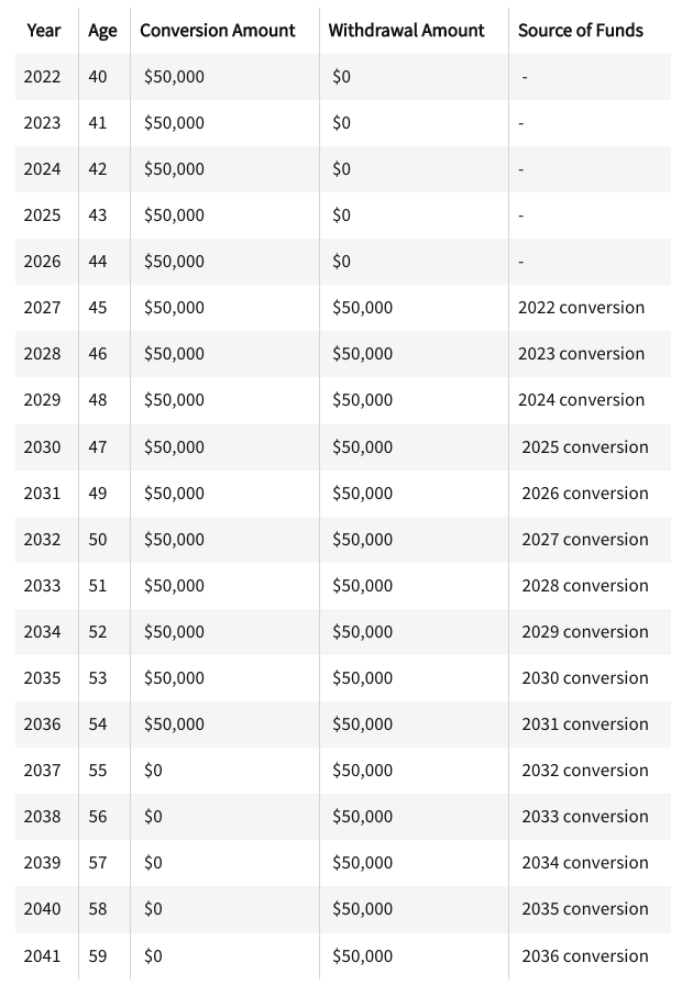 In this example, the early retiree starts at age 40 converting yearly expense amounts from a traditional retirement account to a Roth IRA. After year 5, or age 45, the retiree begins withdrawing the expense amount each year, penalty free. The conversions stop at age 54, because the retiree will have access to all retirement funds in all accounts at age 59 (5 years after the age 54 conversion) penalty free without waiting 5 years.